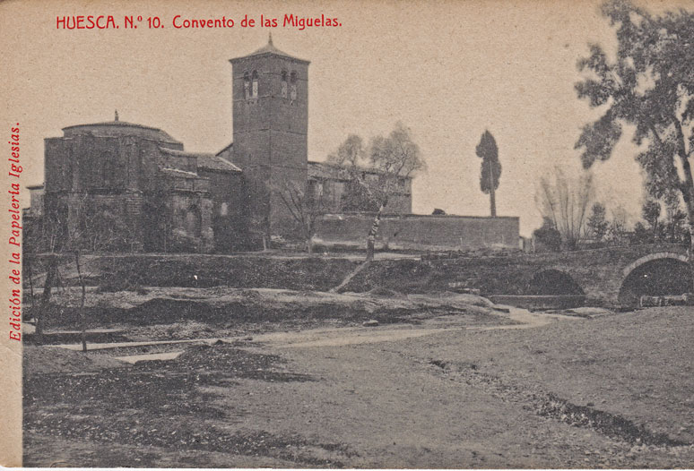 Esta vista del convento oscense de las Miguelas fue realizada a comienzos del siglo XX, hasta 1911, ya que al año siguiente se construía el actual puente sobre el río Isuela. Pertenece a una colección de postales editada por la Papelería Iglesias, popular establecimiento del Coso Bajo, ya desaparecido. La firma de la foto, en el reverso, indica «Thomas. Barcelona».