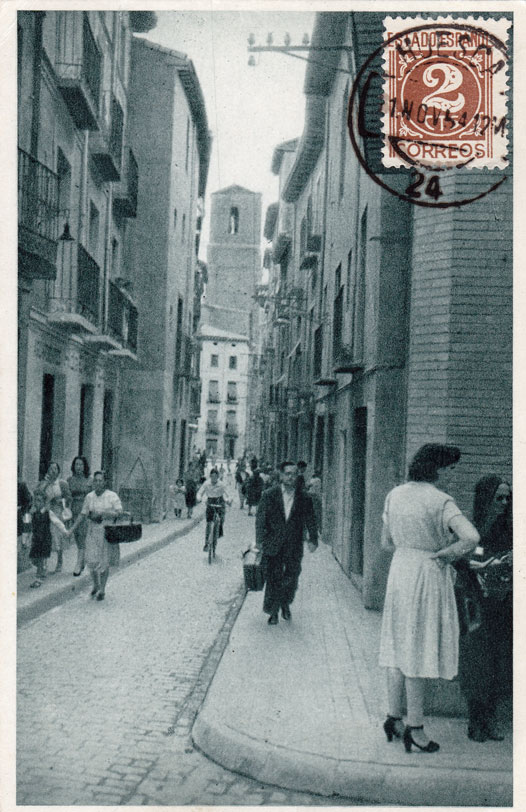 Curiosamente, la postal no está circulada. No tiene nada escrito en el reverso. Pero en el anverso, en la parte superior derecha, luce un sello de 2 céntimos y la leyenda «Estado Español. Correos». El matasellos está fechado en Huesca, el 11 de noviembre de 1954. La postal no era reciente. Los protagonistas de este bodegón urbano lucen ropas de tiempo más caluroso que el otoño.