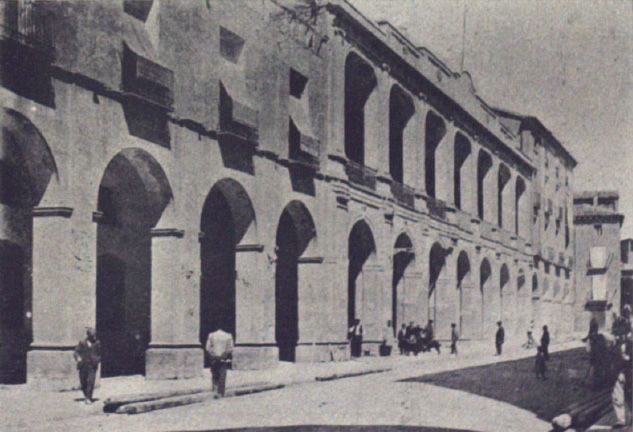 Esta fotografía está publicada en un libro que recoge el viaje que hizo Alfonso XIII en 1903 por diversas provincias españolas, en otras la de Huesca. Entonces eran los Porches de Vega Armijo, título nobiliario de Antonio Aguilar y Correa, ministro de Fomento cuando se tramitó el proyecto del ferrocarril Tardienta-Huesca. Después de la última guerra civil pasó a llamarse Porches de Galicia.