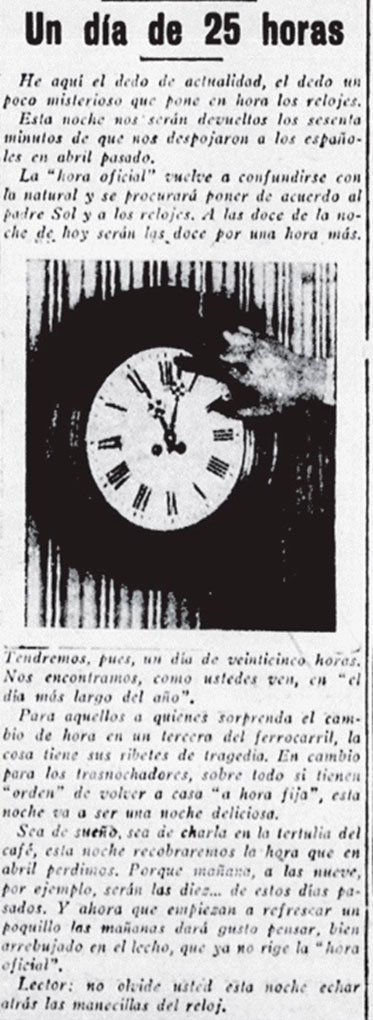 He aquí el dedo de actualidad, el dedo un poco misterioso que pone en hora los relojes. Esta noche nos serán devueltos los sesenta minutos de que nos despojaron a los españoles en abril pasado. La «hora oficial» vuelve a confundirse con la natural y se procurará poner de acuerdo al padre Sol y a los relojes. A las doce de la noche serán las doce por una hora más.