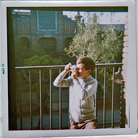 Esta de arriba es la imagen en cuestión. Acababa de recibir el regalo en un teatro de Zaragoza. Llevaba la ropa de los domingos, como correspondía a la invitación. Supongo que solamente posaría para el momento. Si hice una foto, tal como estoy colocado, debió salir bastante mal. Pero bueno, allí pone «may. 71» y estamos la Kodak y yo. Al fondo, la fábrica de galletas Patria en la capital, frente a la que estaba la casa de Antonio y Teresín. Fueron los anfitriones de la comida en esa jornada. Uno de los dos hizo la foto. Seguro que comimos de maravilla.