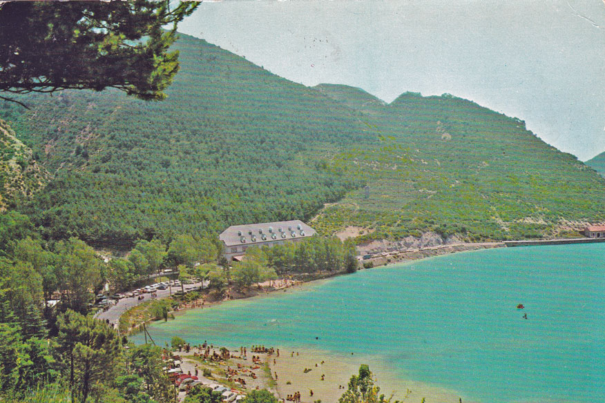 La postal es una edición de Industrial Papelera Oscense, con un depósito legal de Barcelona, y es la número 102 de la serie. La fotografía ofrece un bodegón veraniego que, para quien no conociera este lugar, le podría parecer un pequeño golfo en una costa española. Por ejemplo. Pero no, es el embalse de Arguis, a donde íbamos a remojarnos cuando lo de ir a ver el mar era otra asignatura pendiente. Vamos, cuando Arguis era la playa de la Concha para Huesca.